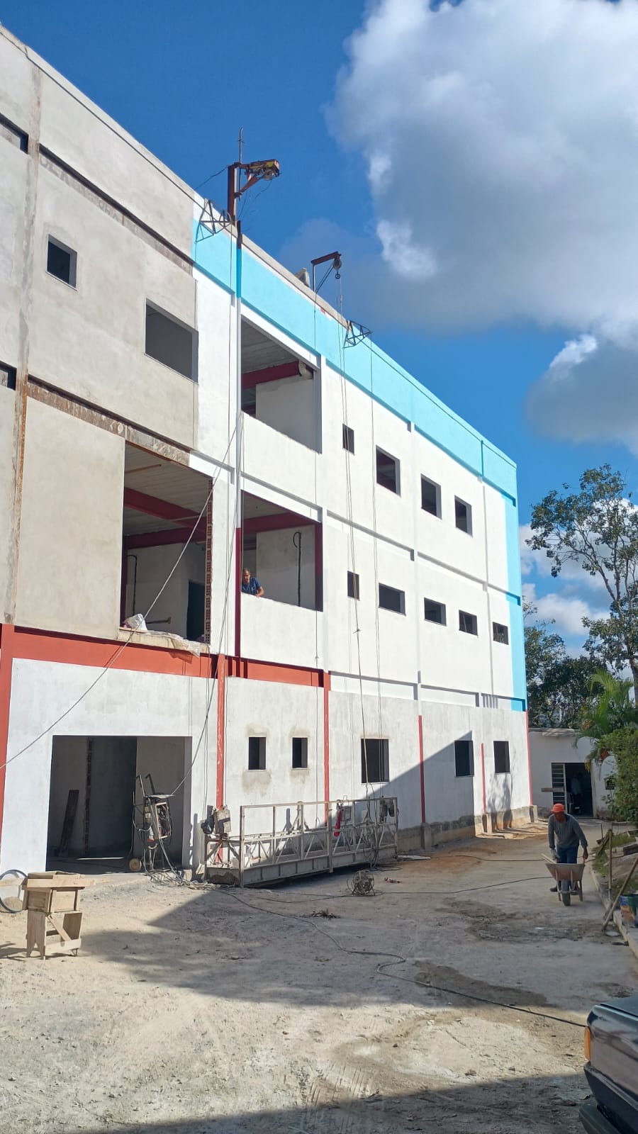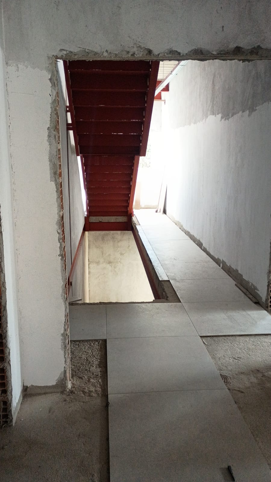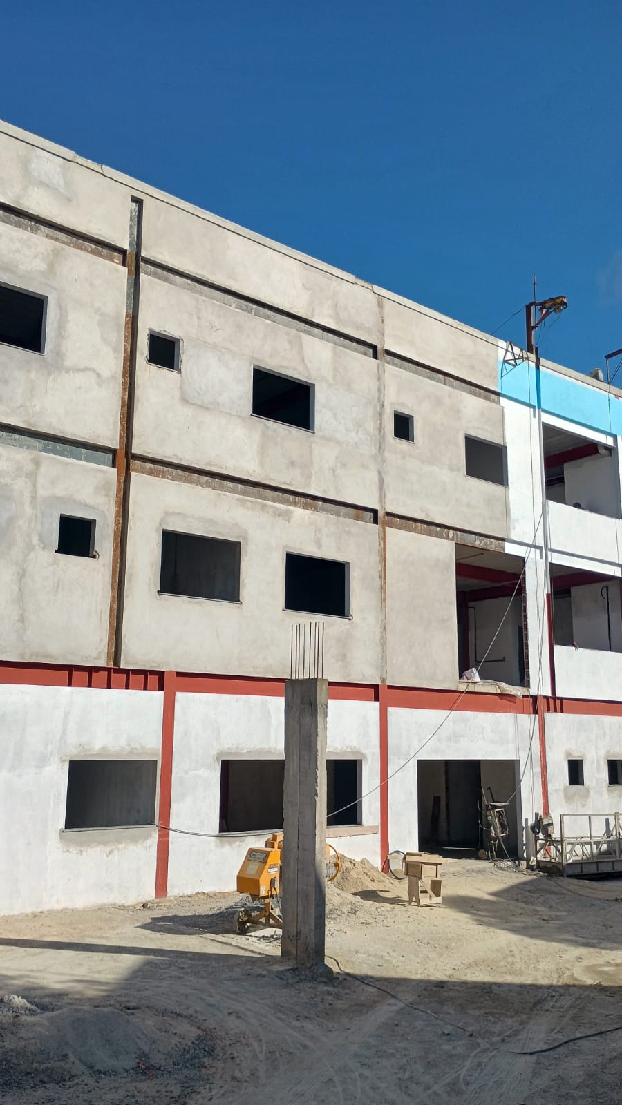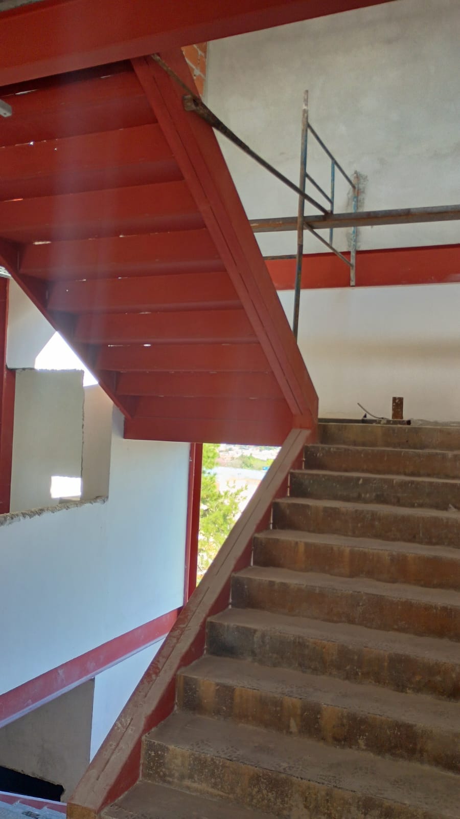 A obra segue em andamento. No primeiro pavimento, uma equipe está realizando a instalação da parte elétrica e hidráulica. No segundo pavimento, uma frente de trabalho executa a pintura das vigas metálicas, enquanto outra se dedica à instalação das calhas para infraestrutura elétrica. Já no terceiro pavimento, uma equipe está aplicando massa corrida nas paredes, e outra realiza a instalação do piso na área onde iria ser o auditório.
