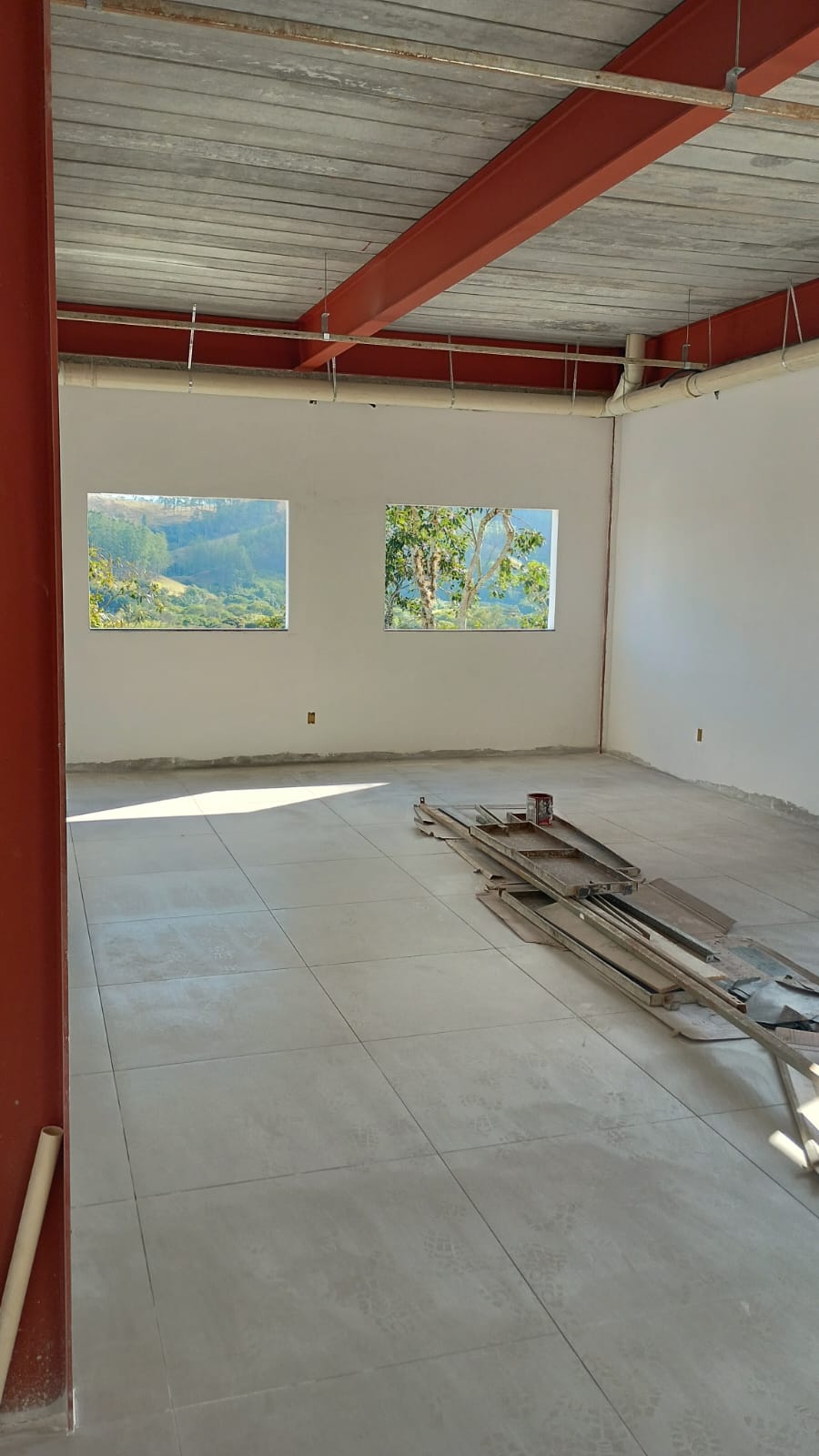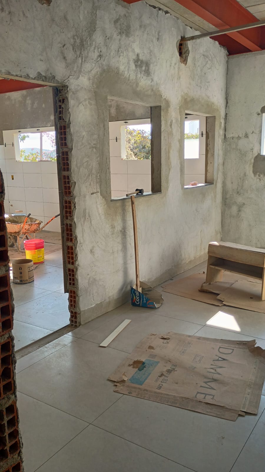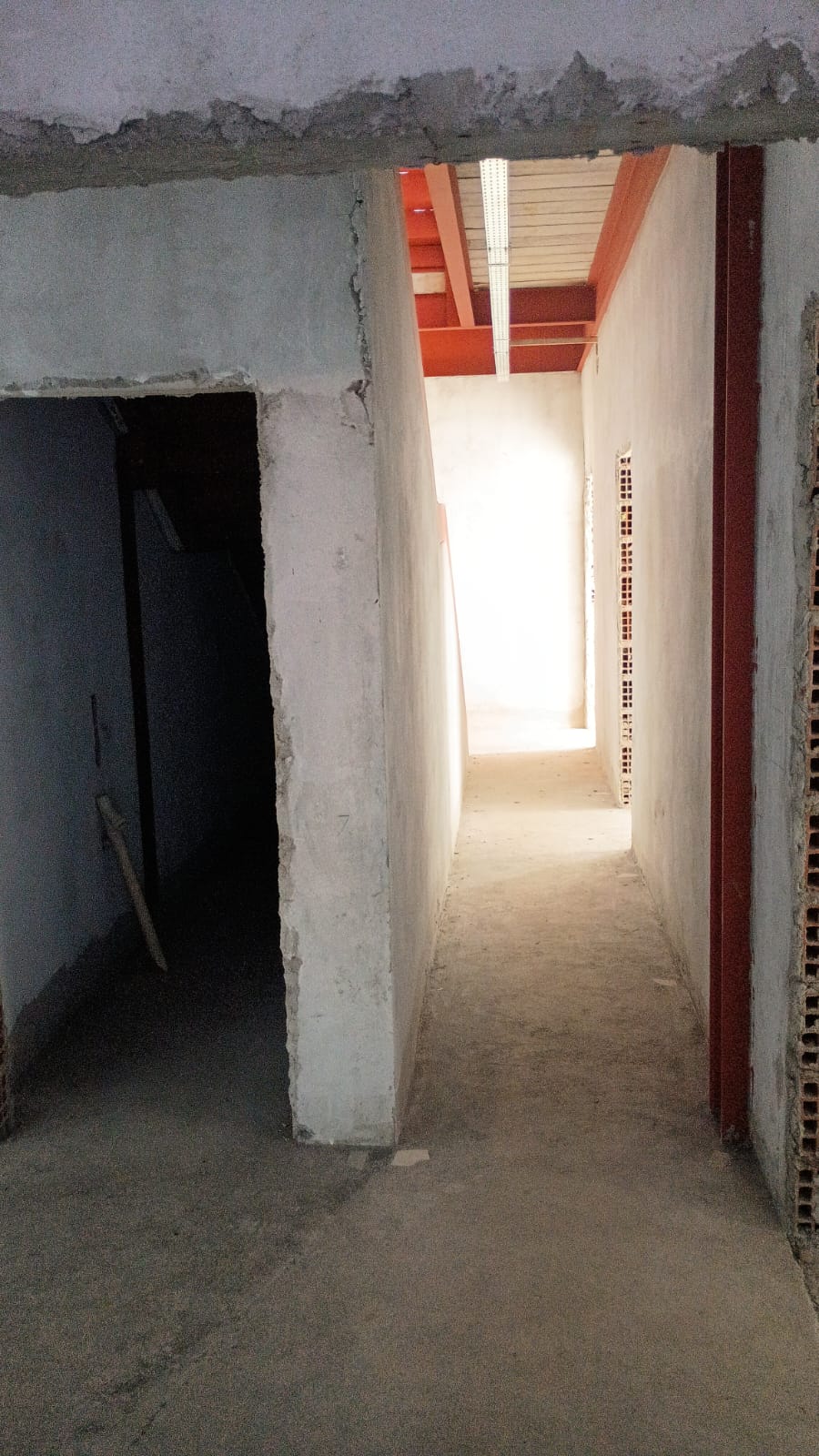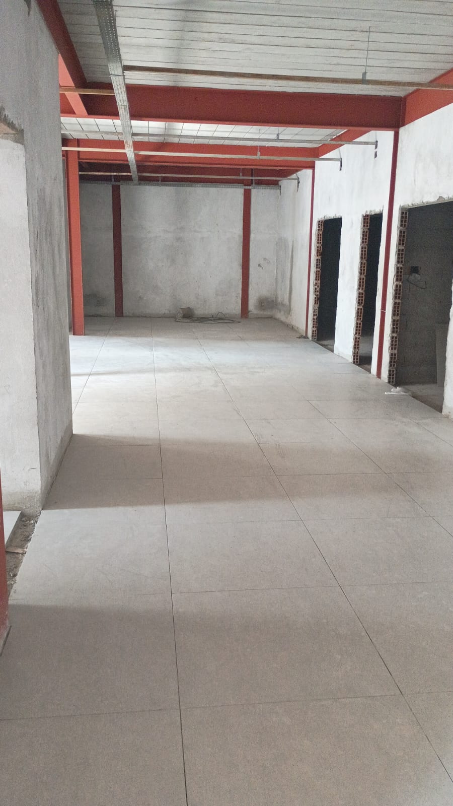 A obra segue em andamento. No primeiro pavimento, uma equipe está realizando a instalação da parte elétrica e hidráulica. No segundo pavimento, uma frente de trabalho executa a pintura das vigas metálicas, enquanto outra se dedica à instalação das calhas para infraestrutura elétrica. Já no terceiro pavimento, uma equipe está aplicando massa corrida nas paredes, e outra realiza a instalação do piso na área onde iria ser o auditório.